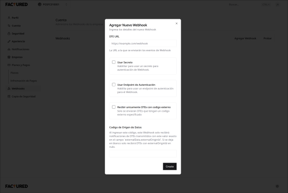 Los webhooks en FEL2 permiten al cliente recibir notificaciones sobre los eventos asincronos sobre ciertos tipos de transmision, particularmente los DTEs generados en contingencia y aquellos transmitidos por API de lotes. La pantalla para agregar, editar o borrar los webhooks se encuentra dentro de las configuraciones de la plataforma.